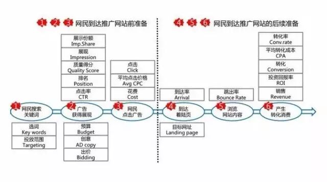 网民通过搜索触发投放关键词,展现推广创意,网民通过(点击)有吸引力的创意,到达广告主网站,寻求自身需求,了解(浏览)产品后,达成消费(转化)。从网民转化径的各动作点,可以反映出各个层级的问题,通过数据分析,优化各指标模块,达成高的ROI。